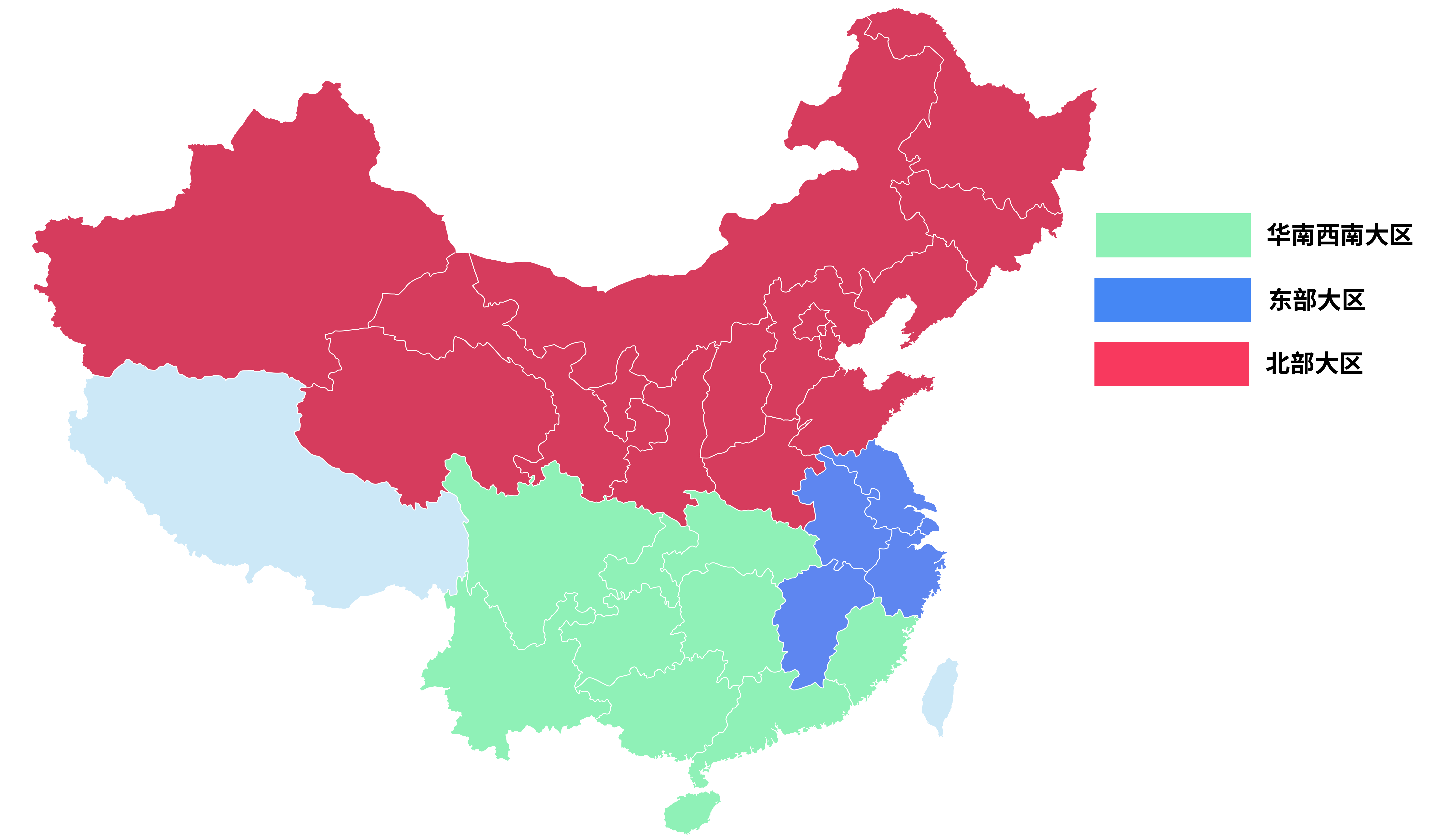 | 北部大区 | 山东、河南、河北、陕西、 山西、北京、天津、辽宁、 吉林、黑龙江、内蒙、宁夏、 青海、甘肃、新疆 |